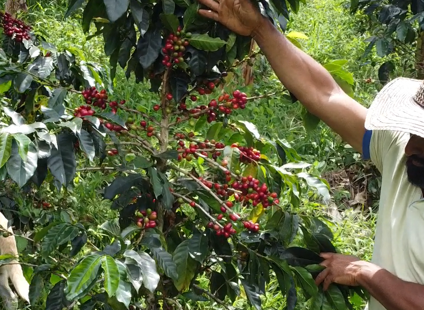 Then it's time to harvest the coffee. You pick the best cherries you can find and bring your harvest down with you.